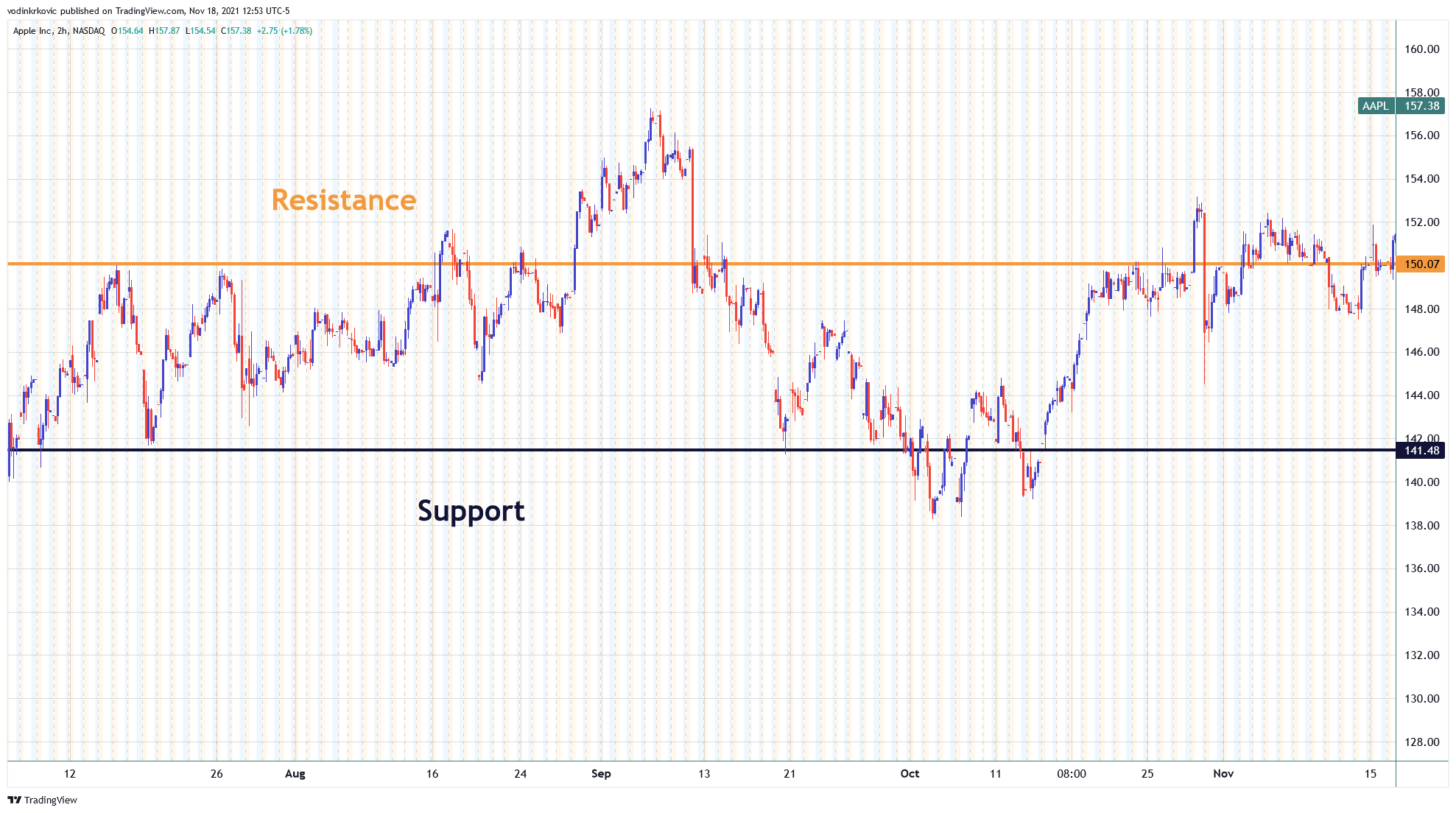 Support and resistance level on a 5-month chart of AAPL. Image by TradingView.
